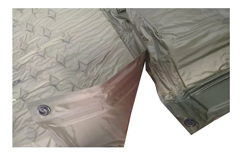 Possui entrada de ar por válvula, sistema interno com núcleo de espuma de células abertas e conta com botões laterais para junção com outros colchonetes.